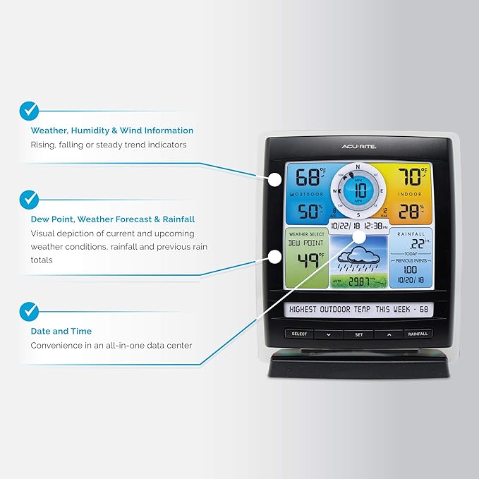 Weather Clock: The indoor weather station display is a large, color LCD Display with the current time, date, and an adjustable dimmer, making it convenient to read and easily view indoor and outdoor data, time, and conditions