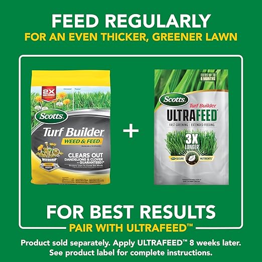 Scotts Turf Builder Weed & Feed3 weed killer plus fertilizer kills existing listed weeds and feeds to thicken your lawn and crowd out future weeds
