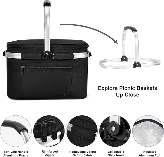 ALLCAMP Picnic Basket - Insulated Cooler, Thickening Foldable Picnic Basket with Removable Baskets & Sewn-in Frame, Basket for House Warming Gifts New Home(Jet Black)
