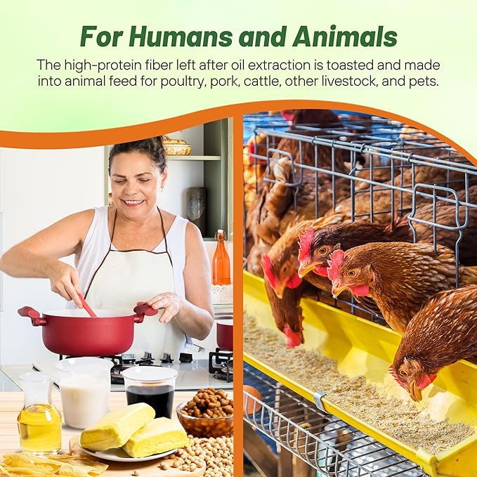 HIGH-PROTEIN ANIMAL FEED: The high-protein fiber left after oil extraction is ideal for animal feed, particularly for poultry and swine industries, which consume over half of the processed soybean meal. This meal is also crucial for cattle, other farm animals, and pets, ensuring they receive the necessary nutrients for growth and development. A great addition to feed mixes for cowpeas and other legumes.