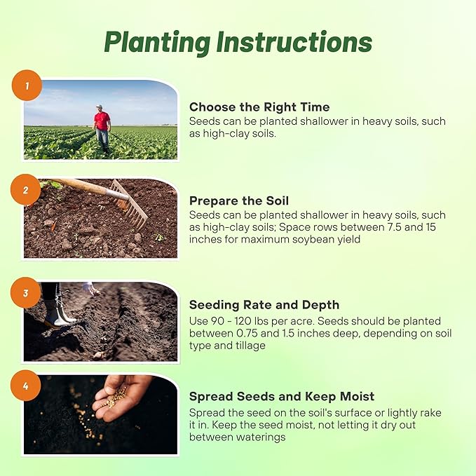 OPTIMAL PLANTING GUIDELINES FOR MAXIMUM YIELD: For best results, plant soybean seeds at a depth of 0.75 to 1.5 inches, with row spacing between 7.5 and 15 inches, depending on soil type and tillage. This ensures uniform seed placement and optimal growth, adapting well to midwestern states and capturing a significant percentage of non-GMO acres.