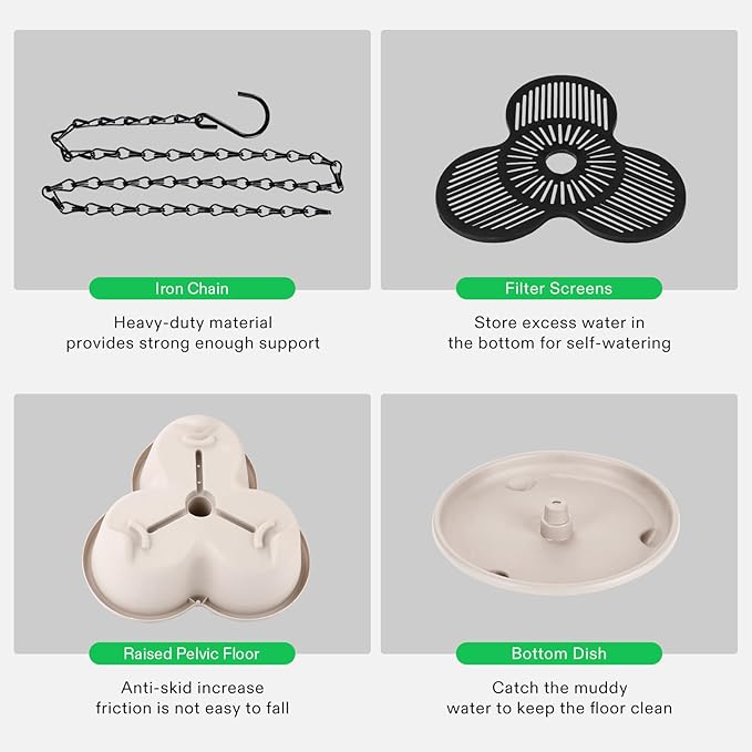 • Flow Design: The water filtration system from top to bottom can effectively save and retain moisture; Meanwhile, the bottom is equipped with a bottom dish that will not stain the ground