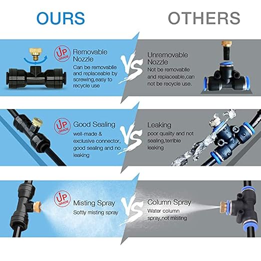 SIMPEL INSTALLATION: The new quick connector mister spray system uses a pneumatic tee connection mode to replace traditional socket connection, plug-and-play irrigation tube, not easy to fall off and leak. Even if a connection is made incorrectly, it can be disassembled and reconnected with a detailed user manual