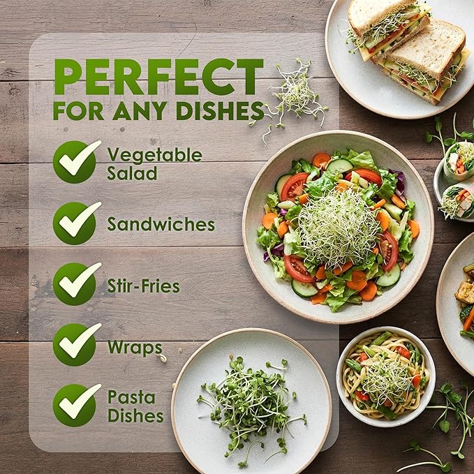 FRESHEN MEALS WITH HOME-GROWN ALFALFA SPROUTS: Elevate your salads, sandwiches, and wraps with crisp, homegrown sprouts from alfalfa seeds. These fresh organic sprouting seeds deliver great flavor and added nutrition to any dish.