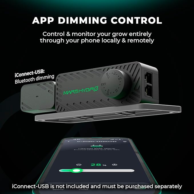 INTEGRATED & 2-IN-1 Design: Shifting from a detachable style to a Integrated design. This not only eliminates the need for installation but also saving commercial growers more installation time. The lighting structure enhanced to a 2-in-1 design featuring both smart and regular lighting modes. To utilize the smart features, the iConnectu Controller must be purchased separately. This WiFi/Bluetooth-enabled controller allows for remote monitoring and equipment control using the MARS HYDRO App from any location. With smart auto-mode and professional grow recipe settings available through the App, users can also manually adjust the light intensity using the dimmer knob.