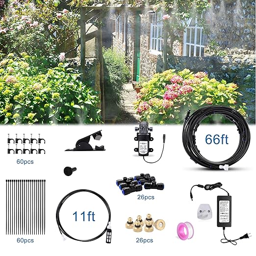【Misting System Product List 】: 1 Instruction, 12V DC 60W 5L/Min self priming sprayer water pump+ power supply, 23.5M/77FT misting line with filter (including 3.5M/11.5FT spray hose+20M/65.6FT spray line), 26 brass misting nozzles, 26 T-tube connectors , 60pcs Cable Ties, 60pcs saddle clamps, 3/4inch(25mm) Standard water tap adapter, 1 PTFE Tape.