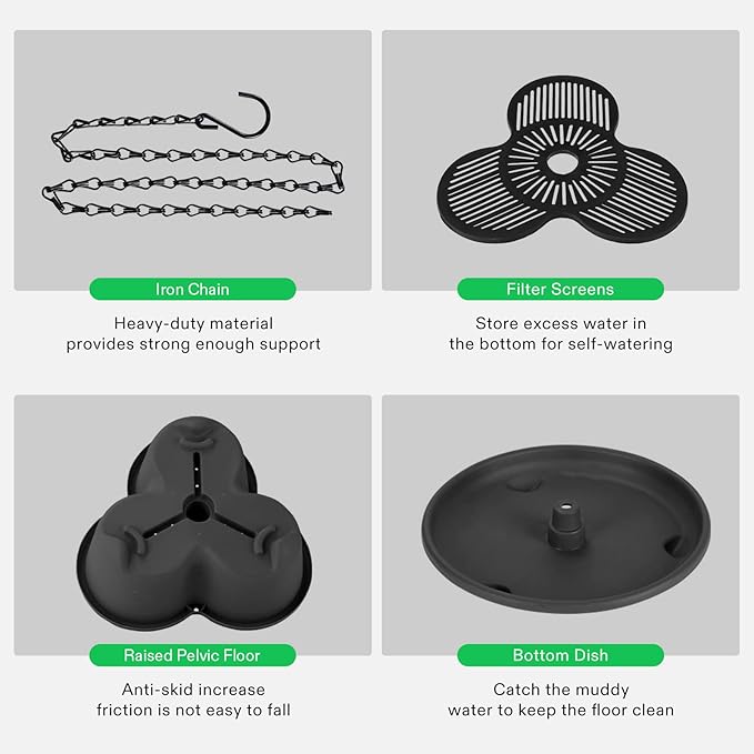 • Flow Design: The water filtration system from top to bottom can effectively save and retain moisture; Meanwhile, the bottom is equipped with a bottom dish that will not stain the ground