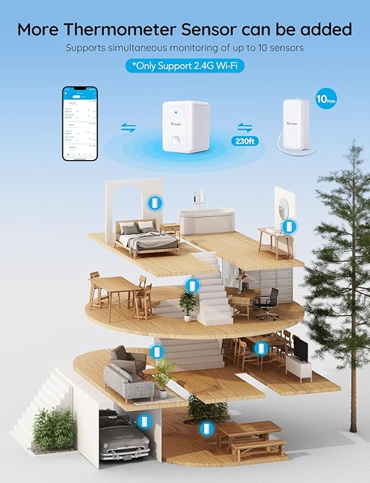 WiFi Gateway: With the 3 included sensors H5100 (Only supports Model H5100 for adding more sensors), you can set them anywhere around your home. Even while you're away, you'll always be able to keep track of your temperature and humidity using the Govee Home App.