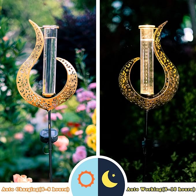 Auto-on Solar Light:This solar rain gauge is eqquiped with high-efficiency solar panel, during the day, the solar panel absorb sunlight for charging. At dusk, LED light automatically turns on, illuminating your yard and garden
