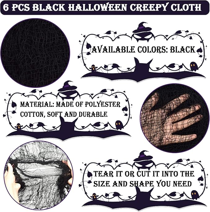 👻【6 Pcs Halloween Creepy Cloth】: You will get 6pcs classic black creepy cloth, which are suitable for decorate different scenes to creat spooky atmosphere.