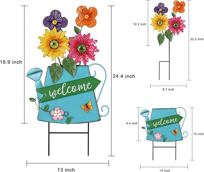 YEAHOME Garden Decor for Outside, 24.4“ Decorative Garden Stakes Metal Watering Can with 4 Flowers for Spring Decor, Welcome Yard Signs for Outdoor Lawn Backyard Patio Porch Pathway Decorations