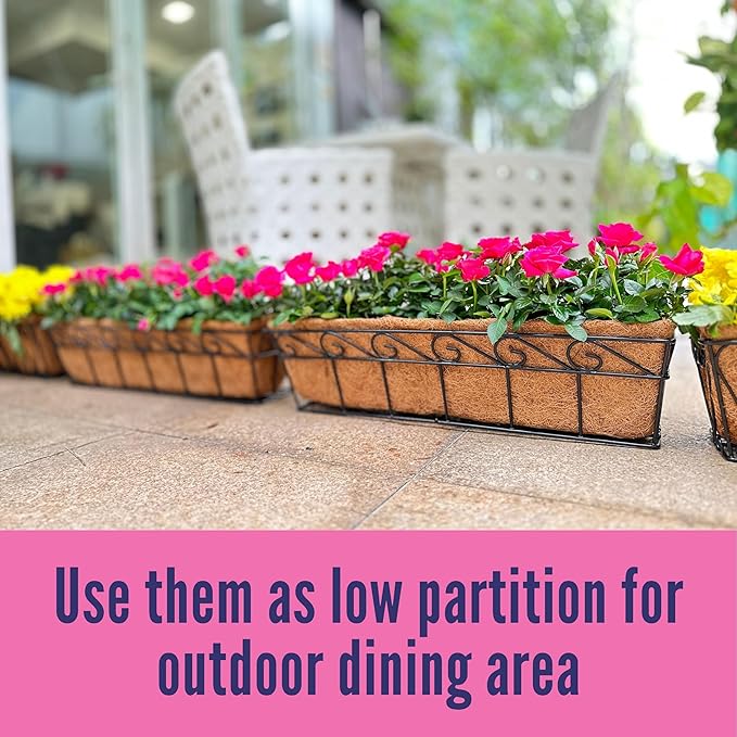 LaLaGreen Large Window Flower Boxes - 2 Pack, 24 Inch Balcony Planter, Deck Railing Planters with Coco Liners Outdoor Wall Pot Plant Holder, Black Metal Horse Trough Fence Patio Porch Over Rail Decor