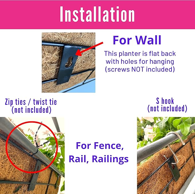 EASY TO USE: This balcony planter DO NOT come with any bracket and hardware due to its multipurpose usage. Just use some simple household hardware such as screws, S hooks, zip ties or twist ties, you can hang it on the wall, rail, railings, fence.... Check our listing images for more idea