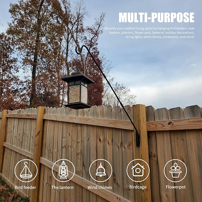 Widely Outdoor Use - Our shepherd hook for outdoor is sturdy and easy to handle. Designed for hanging a variety of bird feeders, suet baskets, lanterns, holiday decorations, string lights, planters, flower pots, wind chimes, ornament to decorative your outdoor living space