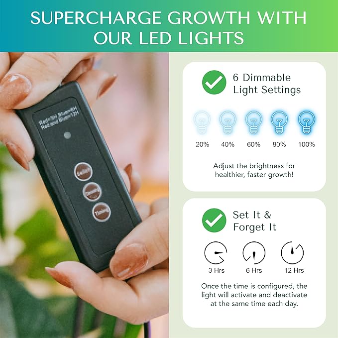 π‘ Grow Lights That Mimic Natural Sunlight π‘ Our dual LED grow lights combine 16 white and 4 blue LEDs to simulate the full spectrum of daylight, giving your seedlings the boost they need for stronger roots and faster growth. Adjustable brightness lets you customize light intensity for herbs, microgreens, or flowers at any stage, ensuring lush, healthy plants year-round.