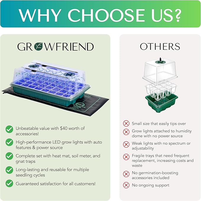 π± All-in-One Indoor Seed Starter Kit π± From basil to begonias, Growfriend makes it easy to grow vibrant plants right from your windowsill. This complete seed starting kit includes a heavy-duty 40-cell tray, dual LED grow lights, a waterproof heat mat, adjustable humidity dome, soil meter, sticky gnat traps, and a bonus gardening eBook - all designed to turn your space into a thriving indoor greenhouse.