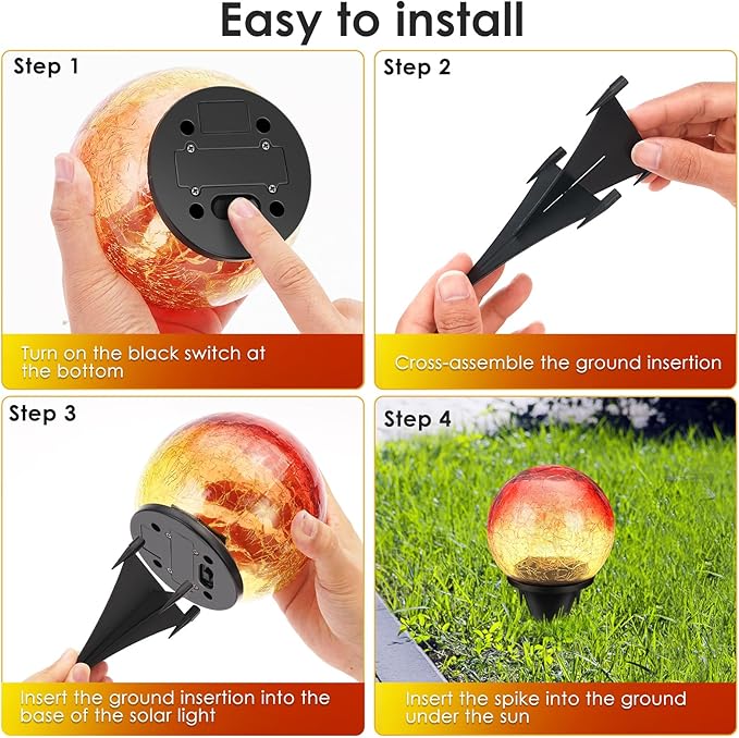 • 2 Easy Install Way: Solar powered, no battery or outlet needed, super convenient to use. It just need only 10-15 seconds to install the solar lights on places it absorb full and direct sunlight. The solar globe lights outdoor can be placed on the table, floor or inserted into the ground with a plug-in board. Try to soften the ground with water and dig a suitable hole for the spike if the ground is too hard