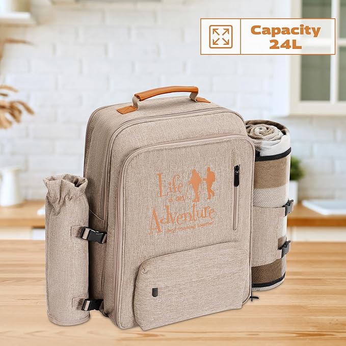 LARGE CAPACITY & WELL EQUIPPED: Size: 12(L)x7.5(W)x16(H) inches, 5.3 lb; The 24L high-capacity picnic backpack big enough to accommodate the ingredients needed for a picnic. Includes a full set of meal preparation tools, thickened waterproof picnic mat, wine bag, and we exclusive gift internal detachable waterproof preservation layer. The bag is made of 600D Oxford fabric and 5mm PE foam and PU layer, which can keep the hot/cold/fresh for hours.