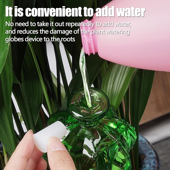 🌼[Not easy to damage the plant root system, protect the root system] These plant watering bulbs have a hole design on the top. After the water is emptied, there is no need to take the plant watering globes out of the pot, just add 80% water directly, and then cover it. Unlike other plant watering devices that need to be removed repeatedly to add water and inserted into the roots of plants, causing root damage.