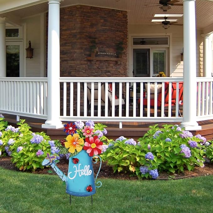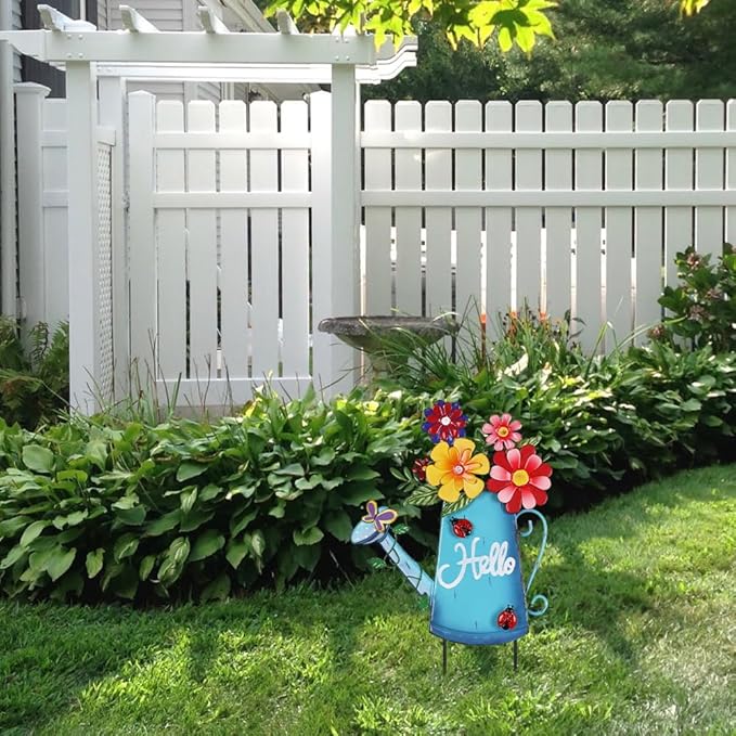 hogardeck Garden Decor for Outside, Metal Watering Can Decorative Garden Stakes with Flowers, Yard Art Welcome Spring Signs for Outdoor Lawn Backyard Porch Patio Garden Decorations