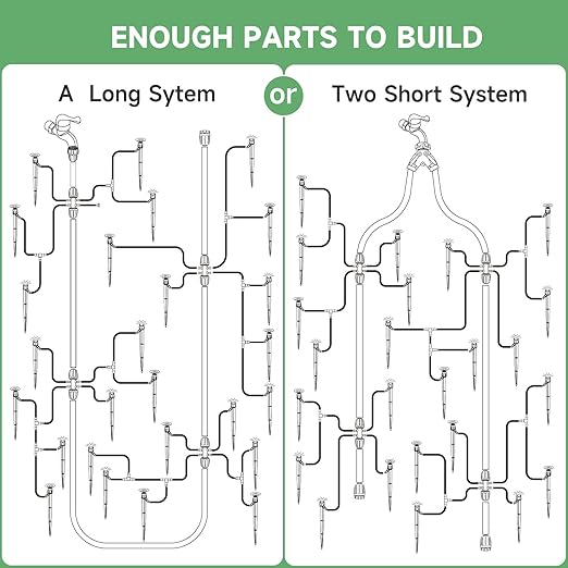 Upgraded Main Tubing: Designed to withstand high water pressure, our enhanced 1/2" diameter main tubing ensures a reliable and constant water flow. Easily split the 40FT tubing to form two systems, each with its own faucet connector for dual setup convenience.