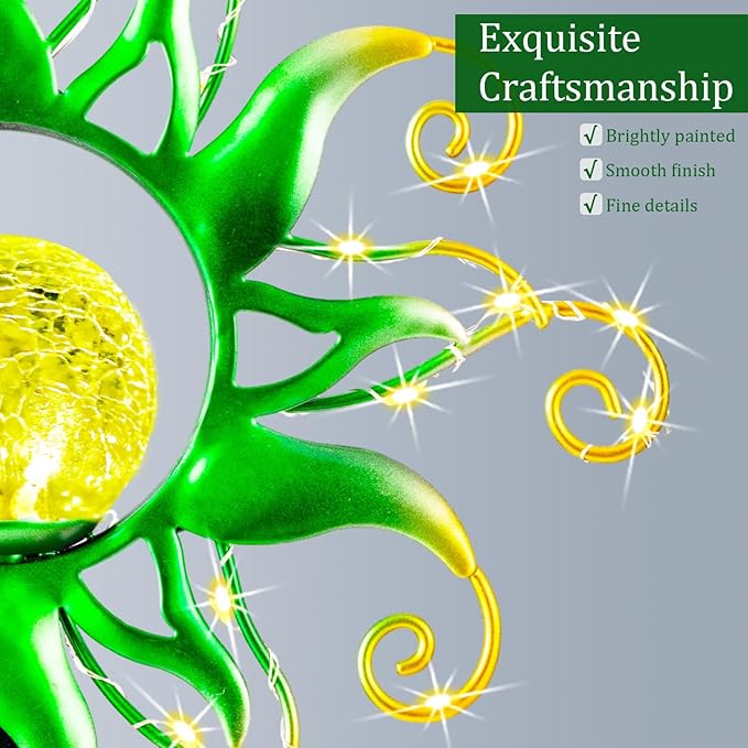 Unique Design & Elegant Aesthetics: Transform your outdoor space with our Solar Garden Lights Outdoor, featuring a stunning green metal sun stake design. The combination of decorative garden stakes and 30 LED waterproof vine string creates a magical ambiance that enhances the beauty of your patio, yard, or lawn. Dimension: 39"H x 12"Lx 12" W.