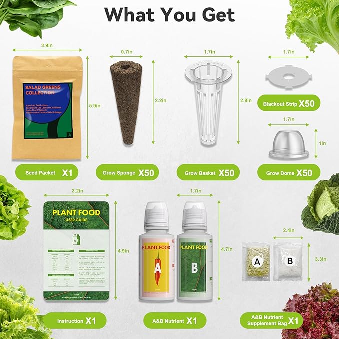 【All-IN-ONE Home Garden】These hydroponic pods provide everything you'll need to start your indoor herb garden. 7 types of 350+ organic salad seeds, 50 growing sponges, growing baskets, growing domes and pod labels, 200ml A&B plant food. It's suitable for both beginners and experienced gardeners