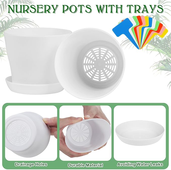 Drainage holes and trays: each plastic planter has small drainage holes at the bottom along with a matching tray to maintain soil drainage and ventilation, allowing plants to breathe freely; the flower seedling nursery pots avoid overwatering; the small holes at the bottom allow for the drainage system not getting clogged, preventing soil leakage and hence protecting the health of the roots and plants
