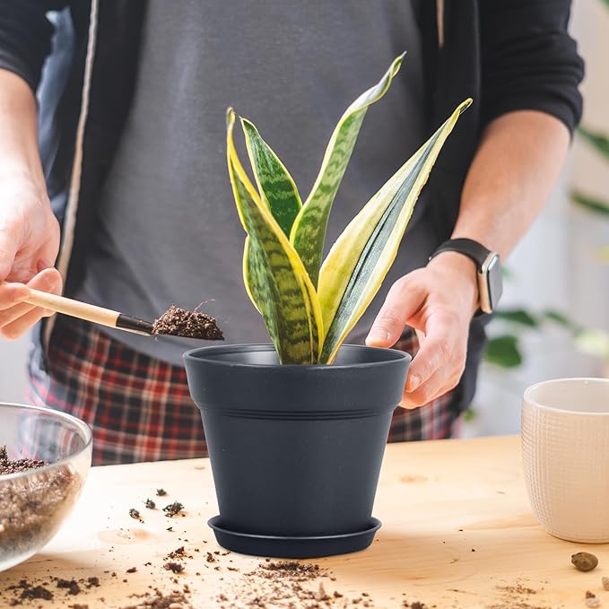 6 inch Nursery Pots, 16 Pack Plastic Plant Pots for Indoor Outdoor Plants, Flower Pots with Drainage Holes and Saucers, Decorative Seedling Starter Planters for House Plants, Black