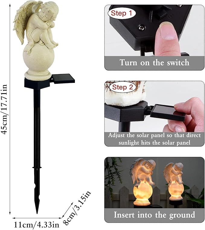 【Easy to Install】Just put the "angel garden statue" on the plastic pole, turn on the switch and then insert the solar light into the loose soil. It is easy to carry and can be used without other tools.