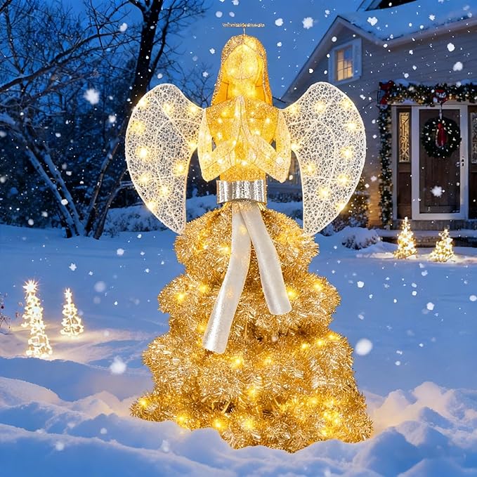 Sturdy & Durable: 33.9“(L) x 28.4”(W) x 59.8"(H) size. Whether placed around the tree or in the yard, they fit perfectly into your holiday decorations. Made of wire, the lighted angel is durable and can withstand harsh winds and snow. All electrical components are UL listed.