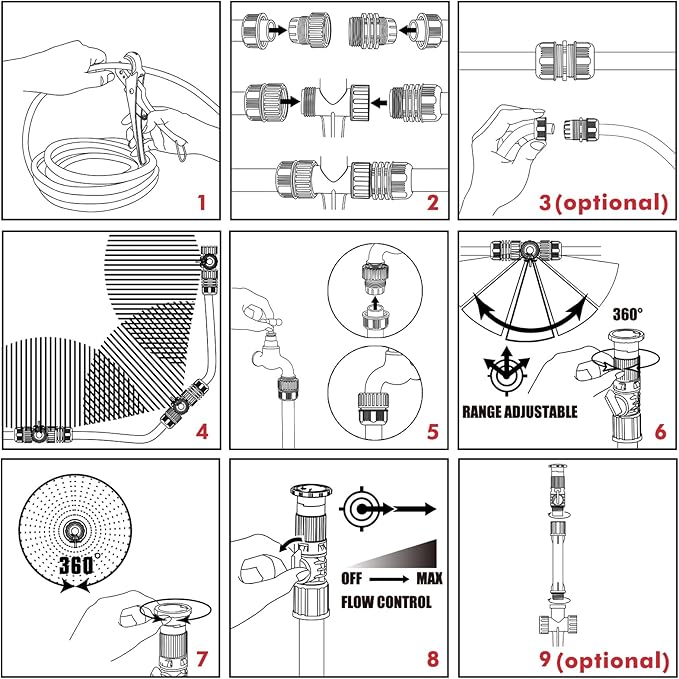 【Packing List】This ULTRA-FLEXIBLE ARC-N-RANGE SPRINKLER SET includes: 3 x 360° adjustable sprinklers, 3 x 5-inch riser, 1 x 30ft 1/2” garden hose, 1 x 3-way hose connector, 3 x 1/2” male thread hose connector, 2 x 1/2” female thread hose connector, 1 x 1/2” hose extender, 2 x end cap.