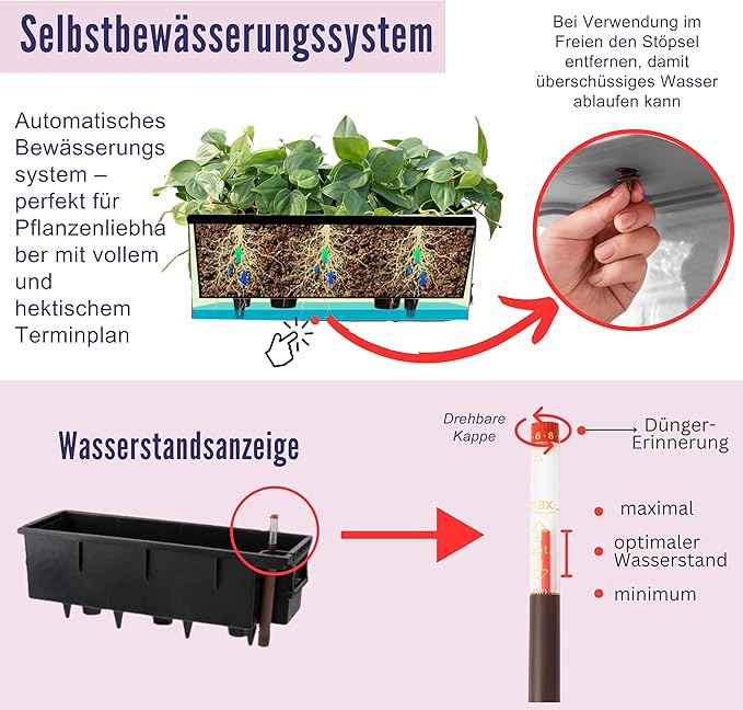 EASY TO USE: Insert the inner planter, fill up the outer planter to optimum water level that shows in the water level indicator, fill in soil and plants and the self-watering system is set to go. This balcony planters for outdoor plants goes well with most of the plants. It keeps the soil moist at all time, watering required every 1-3 weeks time depending on plants and climate. With the water level indicator, it's easy to tell when watering is needed