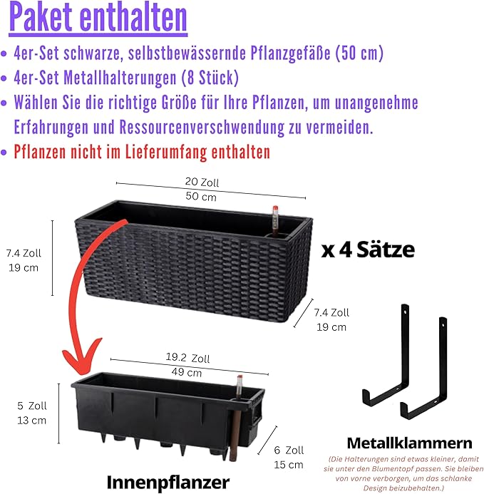 4 PACK SET: 20 inch, black hanging wall planter. Each set come with one outer planter, one inner planter and one water level indicator, please check listing image and video for more details. Pick the right size for your plants to prevent unpleasant experience and potential wastage on resources