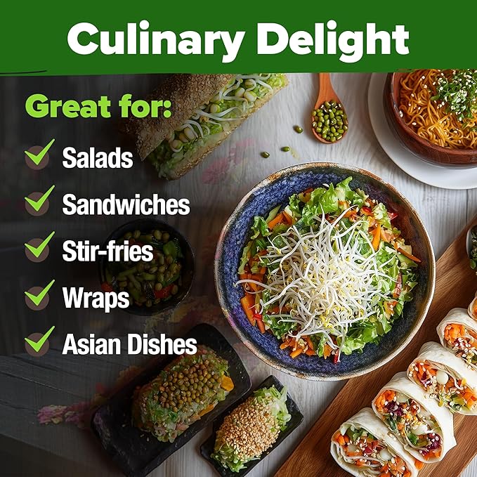 GROW DELICIOUS MUNG BEAN SPROUTS: Sprouts are ready in 2-5 days with no soil required. Simply soak, rinse, and watch them grow into crisp, tender shoots. These sprouting seeds are ideal for adding texture and nutrition to salads, stir-fries, wraps, and more, with minimal effort needed.