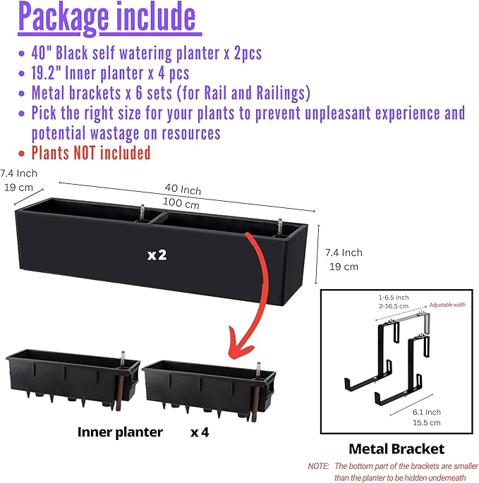 2 PACK SET: 40 Inch, 3 brackets are included due to its big and long size. Black planter boxes outdoor with drainage holes, check image for detailed dimension. Pick the right size for your plants to prevent unpleasant experience and potential wastage on resources
