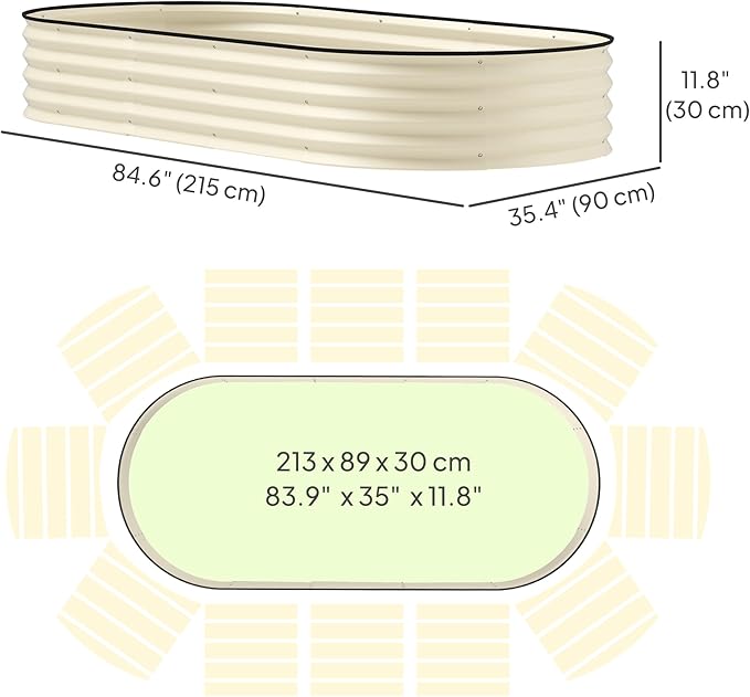 Garden Bed Information: Overall dimension: 84.6"W x 35.4"D x 11.8"H (215 x 90 x 30 cm). Easy assembly required.