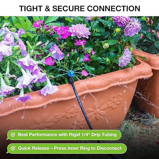 Hassle-Free DIY Installation: Designed for standard 1/4-inch drip tubing, this kit lets you snap in adjustable drip irrigation emitters and irrigation drippers with no tools. Even a beginner can click on the drip irrigation mister heads or micro sprinkler heads and start watering in minutes. Set up your custom drip irrigation system in moments.