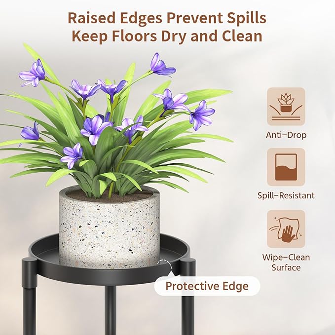 【No More Water Spills】The top tray of the tall minimalist flower stands has a raised edge to prevent any plants from slipping off while also preventing water from spilling during watering. You won’t have to worry about water stains on your floors or carpet anymore!