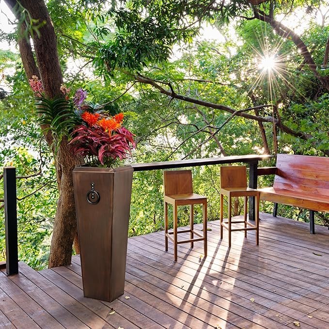 Beautiful Copper Planter: Ready to be the new dynamic accent in your home and garden this large garden planter stands at 35 inches high and is 12 inches square at its widest and tapers to 8 inches square at the base.