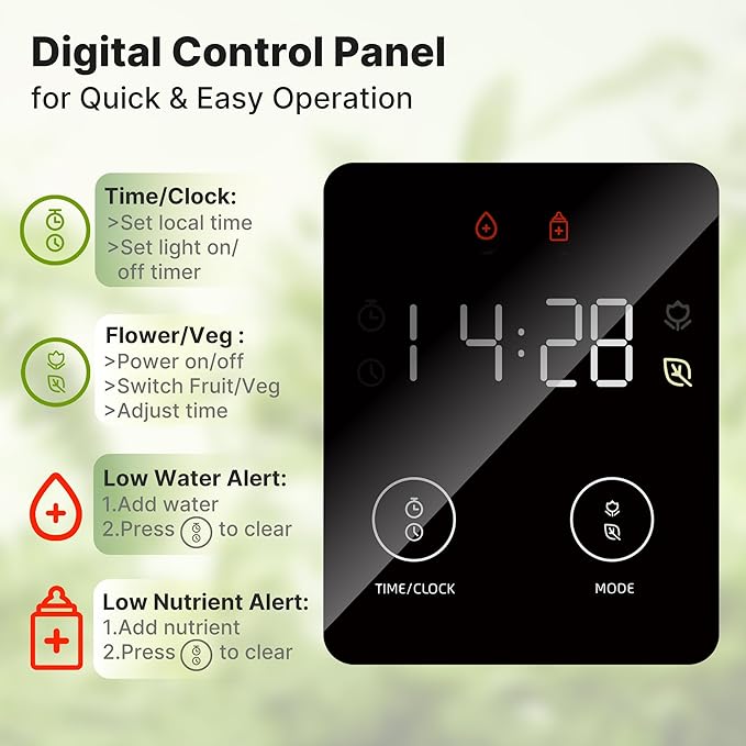 【Light Timer & Water Indicator】 This hydroponics growing system kit allows you to set the light start time to suit your unique growing needs. It also features water level indicators to ensure your plants stay healthy and thriving.