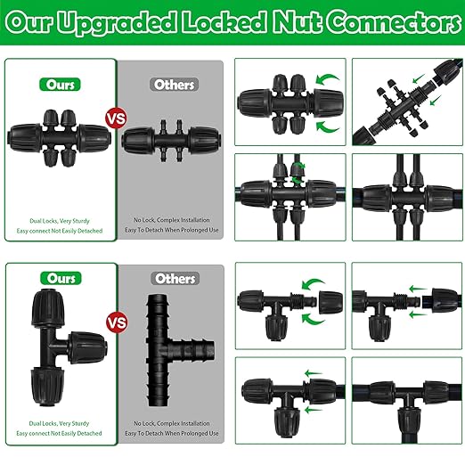 Upgraded Quick Connect Design, Efficiency Boost: The 4-way connector, tee, and emitter of our garden drip irrigation system feature upgraded locked nut design, make them easy to connect with 1/4" irrigation tubing; what's more, the 360° tight structure of these dual locked nut ensures pipes stay firmly locked, resistant irrigation tubing loosening or detachment when dripping, sprinkling, misting, even in high-pressure water, ensure the garden irrigation system working well in any time and any place.