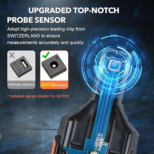 HIGH-PRECISION THERMOMETER HYGROMETER - Different from traditional temperature humidity meter, we adopt a high-precision semiconductor sensor from SWITZERLAND to ensure measurements accurately and quickly. With short response time and strong anti-interference ability, the TH10 digital thermometer can be used for a wide range of applications.