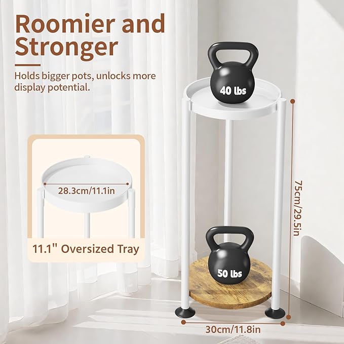 【Large Trays for Bigger Plants】The upgraded 11.1-inch wider trays offer more space than most on the market, giving you plenty of space for larger planters. Each tray can hold over 40 pounds, making it a perfect fit for those hefty cement pots that other planter stands just can't handle.
