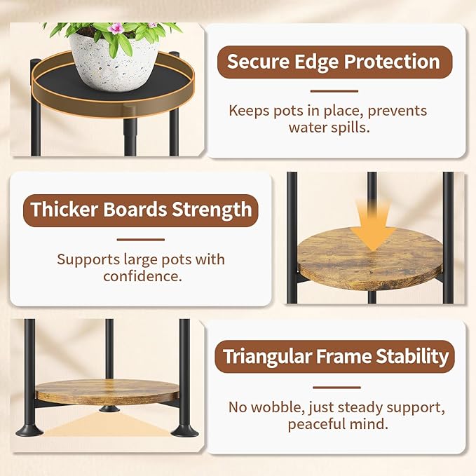 【Adjustable Feet for Any Surface】 No need to worry about uneven floors! The heavy duty plant stand features three adjustable feet that keep it perfectly balanced, whether it’s on carpet, tile, or hardwood—plus, they also protect your floors from scratches.