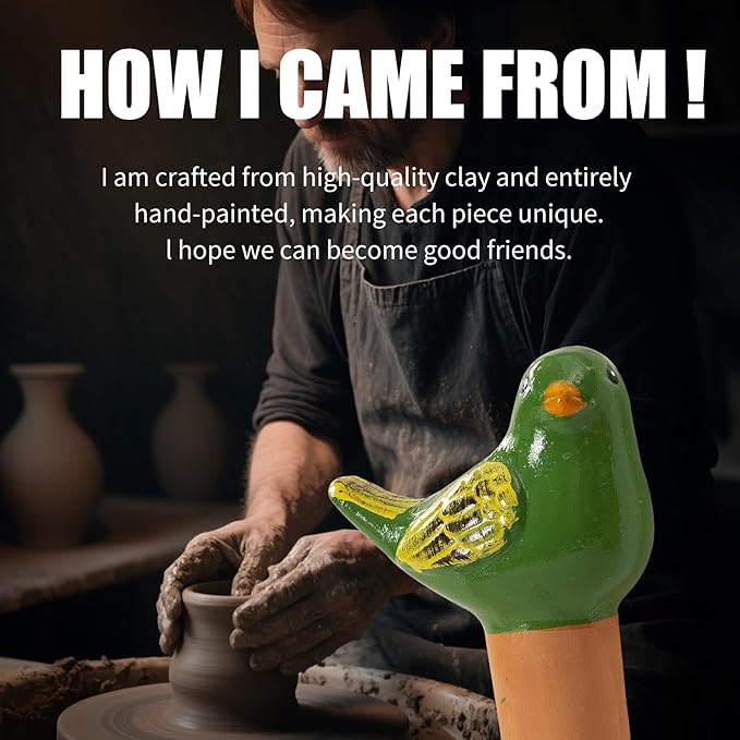 Charming Handcrafted Bird Design:Includes 4 handmade terracotta birds in green, blue, pink, and yellow. Each measures approx. 6.85" H × 3.27" W × 2.05" D and holds 4.23 oz.