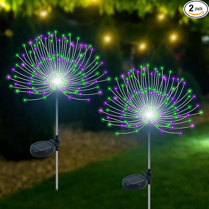 Solar Garden Lights Outdoor Waterproof, 2 Pack 120 LED Solar Firework Lights Decorative Garden Décor Outside for Flowerbed Pathway Party Halloween Christmas Decorations, Green + Purple