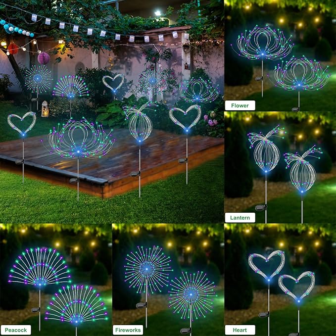 120 LED Solar Lights for Outside: Our upgraded creative solar garden fireworks lights have 120 LED beads, more beautiful and brighter than the other fireworks lights with 105 beads. You can DIY any shape as you like to creat a beautiful and colorful light spots lifelike fireworks, lighting up your beautiful garden, yard, sidewalk, etc.