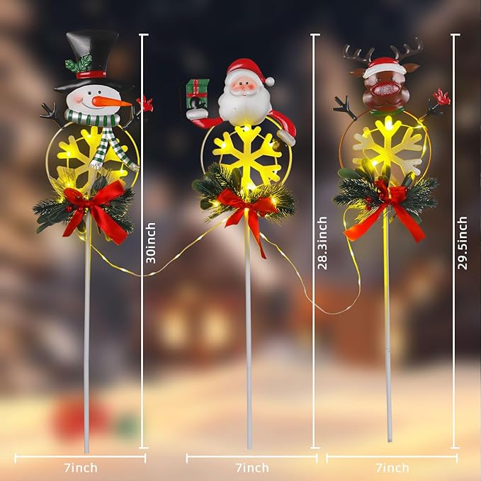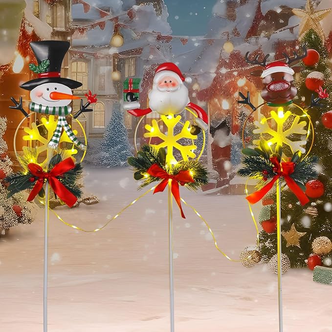 Classical Christmas Decorations Set: This 3-piece Christmas solar yard stakes collection include Santa Claus, snowman and reindeer designs, each set with pine leaves, berries, red bows and 60 warm LED string lights to create festive cheer.