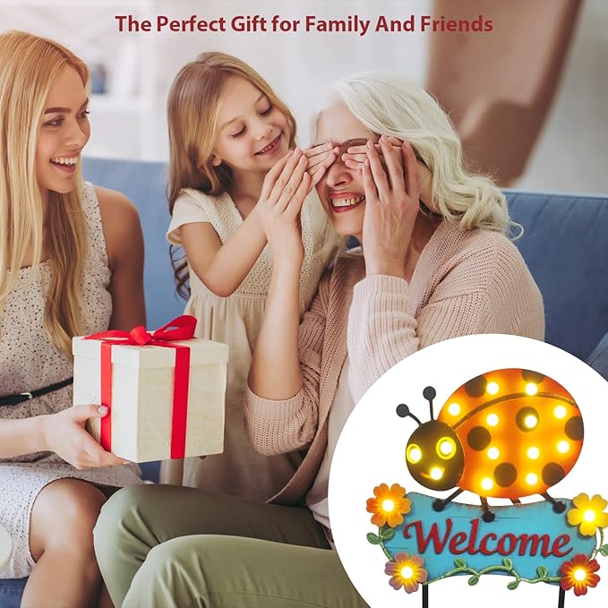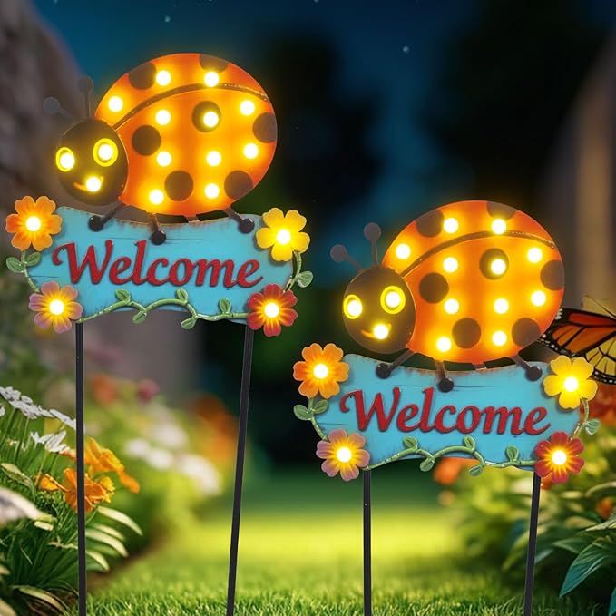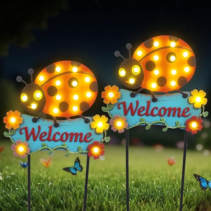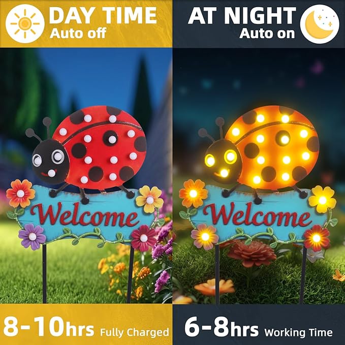 Adorable 43.3" Tall Ladybug Solar Stakes: These decorative solar garden stake lights feature bright red ladybugs with cute flower accents and a "Welcome" sign and shining with 18 solar lights string, adding a cheerful touch to gardens, yards, or patios.